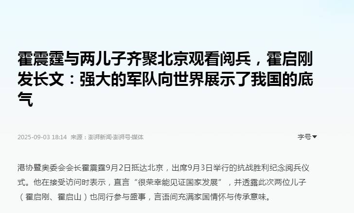 爱国这门课程,霍家一直是满分。香港的霍氏父子三人承接爷爷辈好家风,登上了城楼观赏阅兵礼。爷爷霍英东毕竟是在生前参加过三次以上观礼仪式的爱国商人,可是自从他去世以后,就很少有人报道他的爱国事迹了。