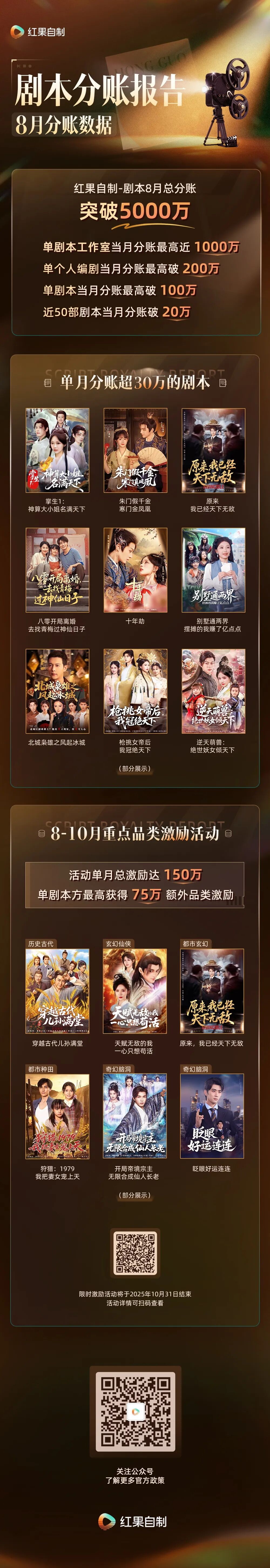 也就是说,参与红果自制剧剧本创作的编剧们(以个人或工作室为单位),8月份一共拿到了5000多万。