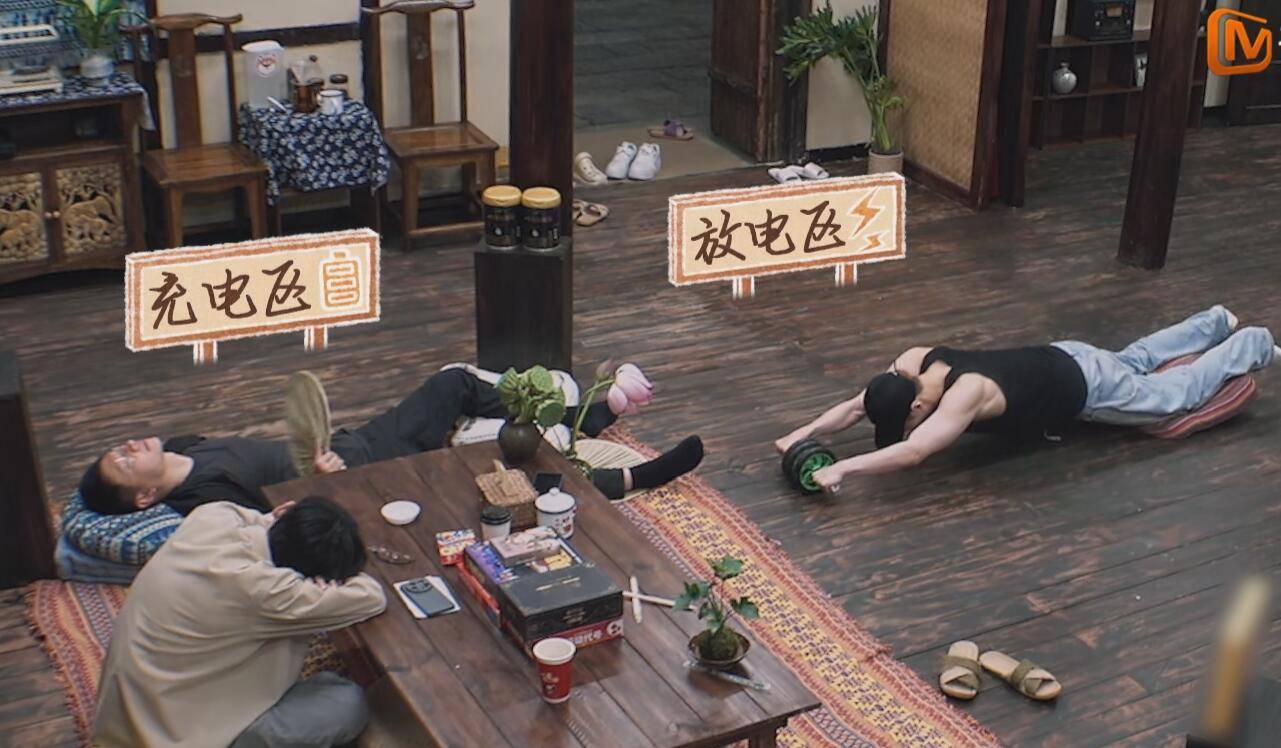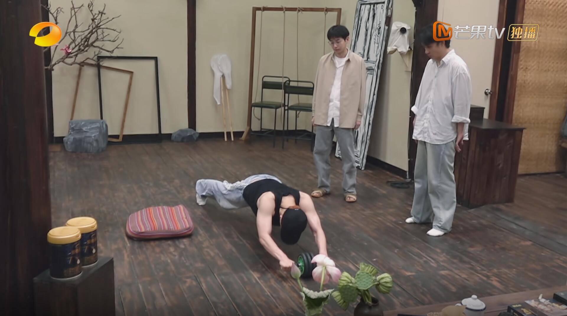这次张艺兴选择了和大家一起待在客厅,只是别人在休息,他在锻炼。