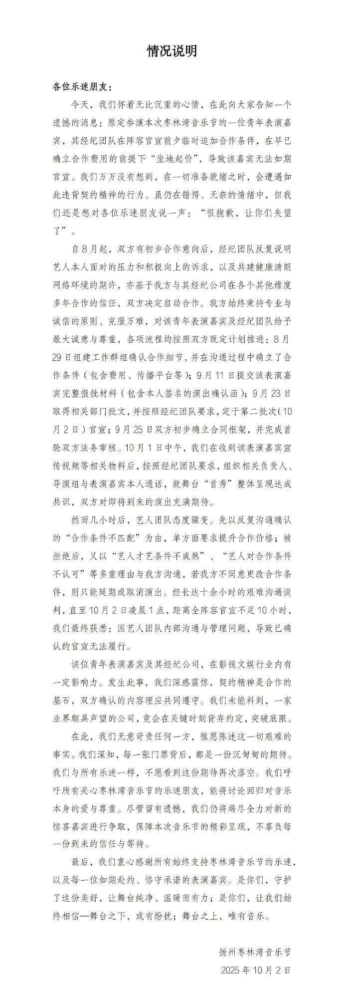 搜狐娱乐讯 10月2日,扬州枣林湾音乐节官微发布情况说明,称原定参演音乐节的青年表演嘉宾经纪团队在阵容官宣前临时追加合作条件、在已确立合作费用的前提下“坐地起价”,导致无法官宣。