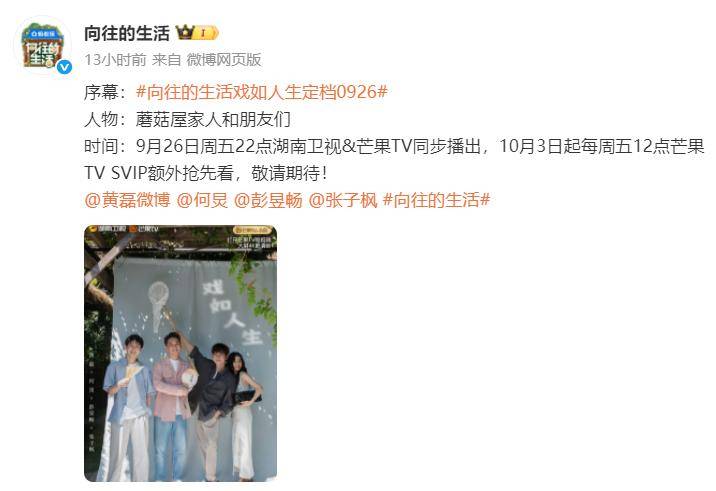 《向往的生活》第八季官宣啦!据官方发布,这一季的主视觉海报与阵容都尘埃落定——常驻嘉宾为黄磊、何炅、彭昱畅、张子枫,海报主题定为“戏如人生”。