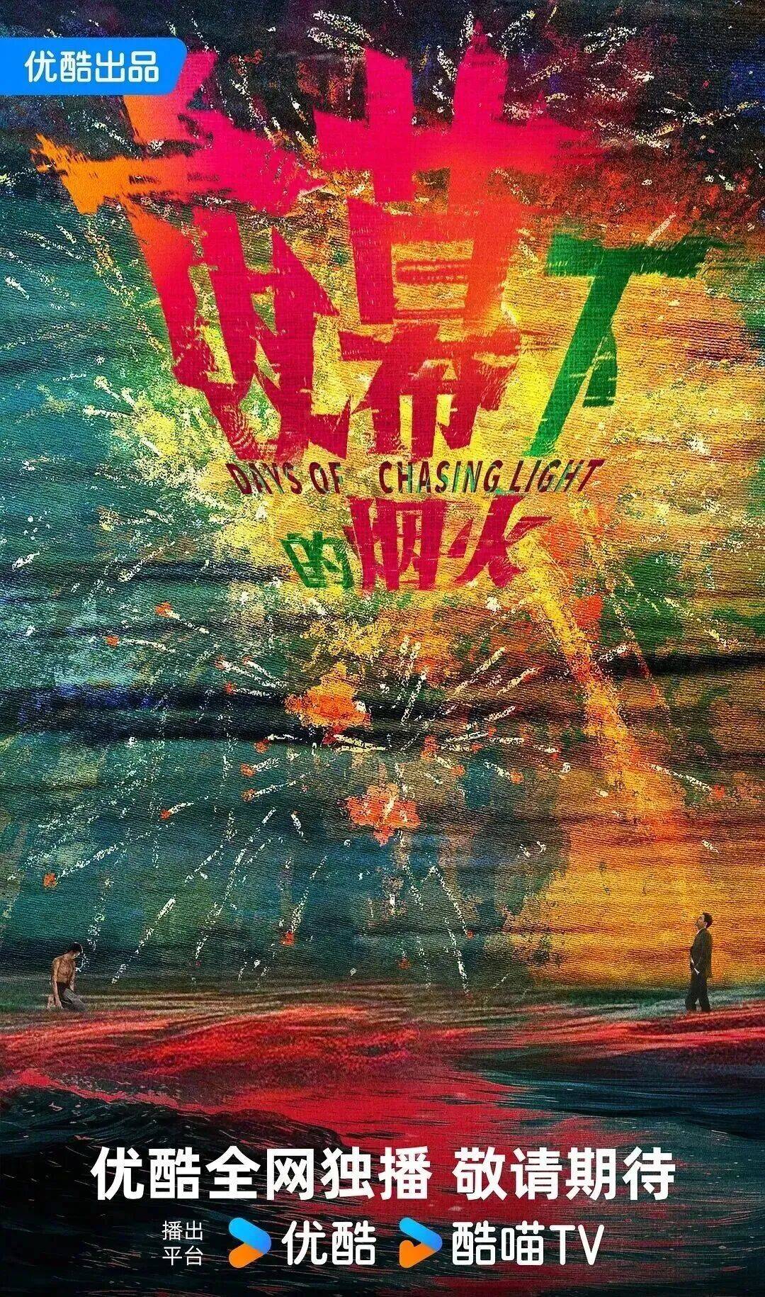 满天璀璨烟火下是映衬成火红色的小河,河流的两岸,一边是抬头仰望烟火的男人,一边则是半跪着的男人。极尽绚烂中又带着些许寂寞悲伤意味。