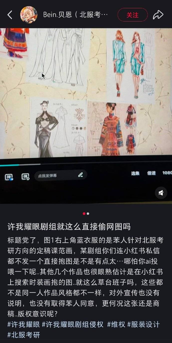 搜狐娱乐讯 近日,多位博主称被《许我耀眼》剧组盗图。插画师束蒲坤在10月3日晚发文指控剧组未经授权在多集剧情中使用其多幅画稿作为道具,通过粉丝提醒才知情。北服导师Bein.贝恩称其服装设计课商稿范画(具商业版权属性)被直接挪用,质疑剧组“未做任何修改或沟通”。摄影师時頭TStone称民族主题时尚创作片被用作女主团队创业的“参考图”。