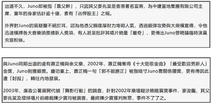 麦浚龙的父亲是港圈商界大佬,有凶悍股王之称,麦浚龙进圈做歌手,上来就横扫各大奖项新人奖,被质疑靠着富二代身份花钱买奖。