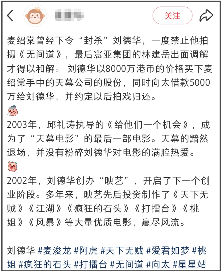还有刘德华粉丝站出来忆往昔,表示麦浚龙的父亲还封杀过刘德华,刘德华差点就拍不上《无间道》了。