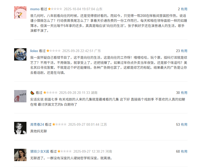 在诸多差评中,很多人都对节目组转型成以“戏剧”为主题感到不满,认为节目是在借“向往”的壳做别的节目。曾经《向往的生活》的初心是放慢脚步、放下工作,去感受和投身田园生活,而如今初心似乎也已经发生了改变,你们觉得新一季节目观感如何呢?