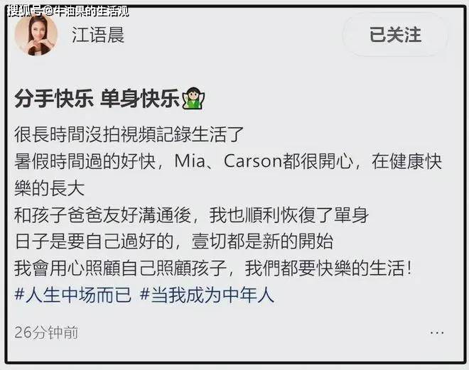 10月3日,周杰伦前女友江语晨突然官宣离婚,她说分手快乐单身快乐,宣布与美籍机师Josh Anderson结束九年的婚姻。