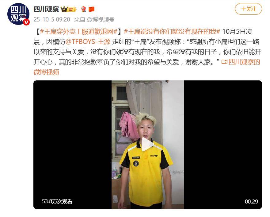 10月5日凌晨,网红“王扁”的一则退网声明视频,猝不及防地登上了热搜。镜头里,他身穿外卖工服,语带哽咽地感谢粉丝“小扁担”,声称“没有你们就没有现在的我”,并以“辜负期望”为由,宣布将永久退出网络。