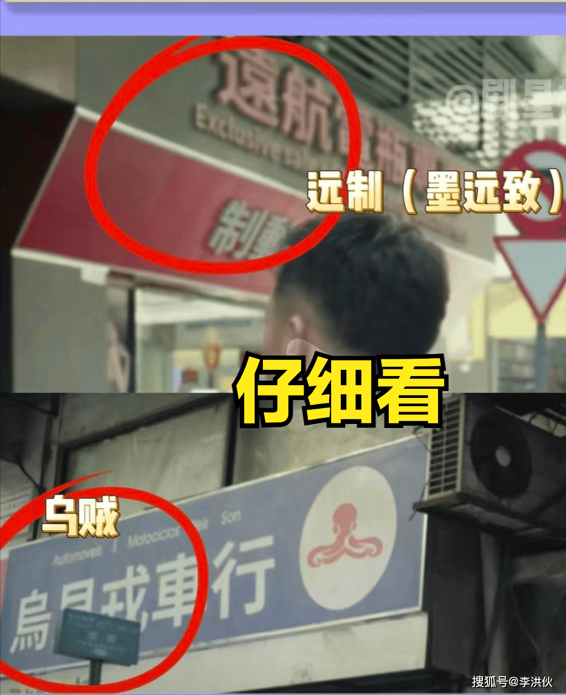 还记得第一集那段银行抢劫案吗?这段剧情也是十分精彩刺激,几个劫匪抢完钱之后开车离开的时候,镜头快速扫过车前面的街景,几个一闪而过的招牌上的第一个字连在一起就是“结匪死四仁”,早就预示了劫匪的结局。