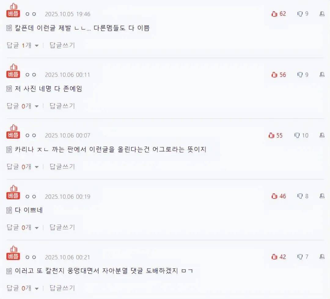不过,争议刚冒头,护团心切的粉丝们就火速控场。评论区很快被“全员美女”的声浪淹没:“求别再发这种对比帖了……其他成员明明也都很好看”“照片里四位成员都美得不可方物”。更有网友一针见血地指出,在Karina近期屡遭批评的舆论环境下,这种帖子根本是“精准引战”,只会让评论区陷入“吹毛求疵和自相矛盾的争论”。