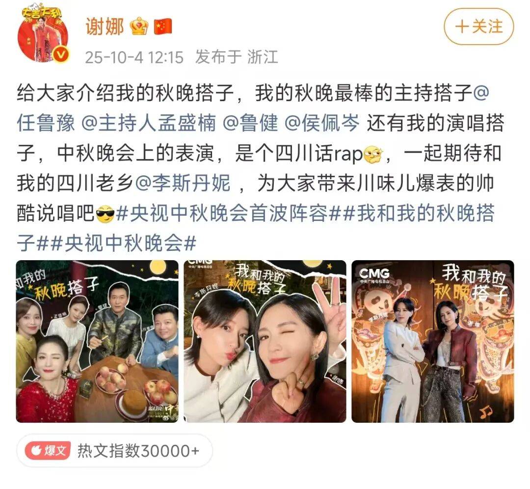 央视中秋晚会节目单出了,谢娜的名字赫然在列。