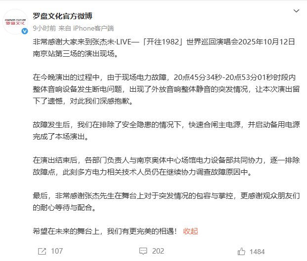13日凌晨,主办方罗盘文化发文:非常感谢大家来到张杰未·LIVE—「开往1982」世界巡回演唱会2025年10月12日南京站第三场的演出现场。在今晚演出的过程中,由于现场电力故障,20点45分34秒-20点53分01秒时段内整体音响设备发生断电问题,出现了外放音响整体静音的突发情况,让本次演出留下了遗憾,对此我们深感抱歉。