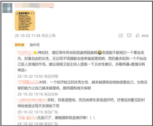 节目片段上了热搜,热搜话题还是“唐嫣被认证婚后越来越美”,乍一看像是夸唐嫣婚姻幸福,但某种程度上,把唐嫣客体化了,相当于透过唐嫣给罗晋附魅,特别是和靳梦佳对话的男嘉宾还来了一句“找个好老公很重要”,更是引发网友逆反。