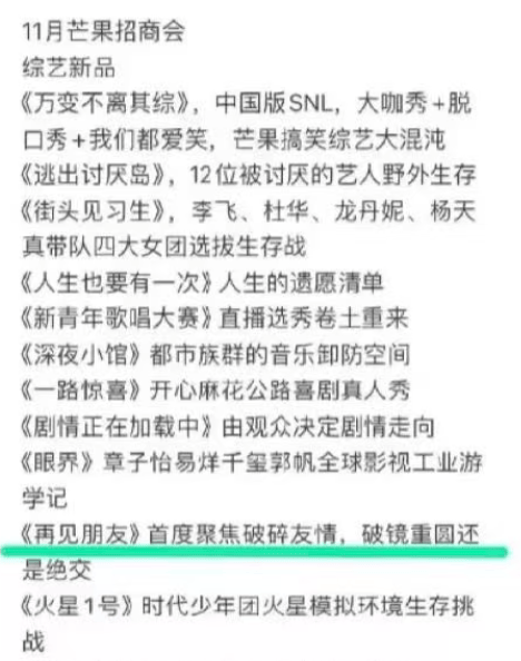 去年11月份芒果招商大会上,就直接把《再见朋友》给写了进去: