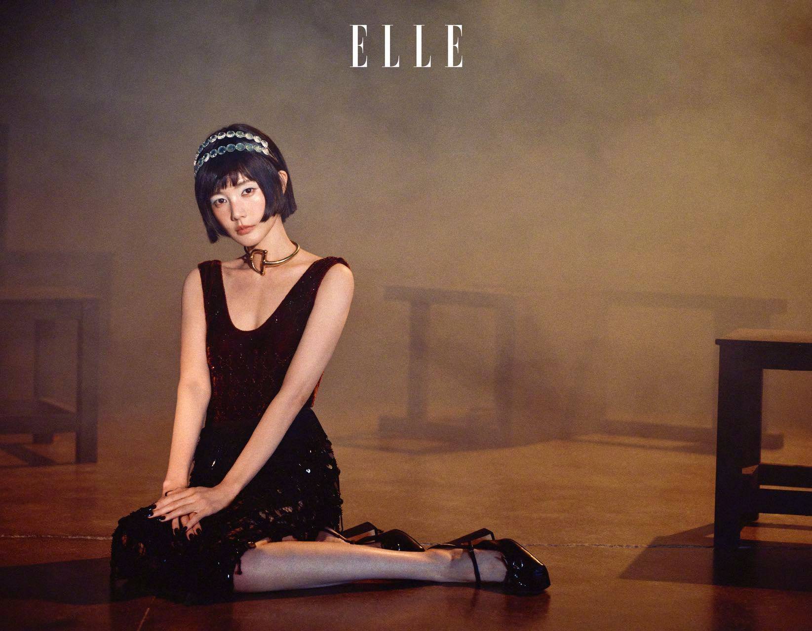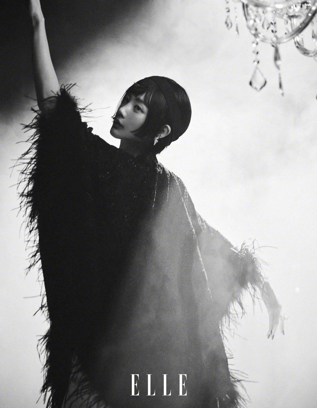 李一桐穿羽毛装饰的黑色服饰,神秘又迷人。