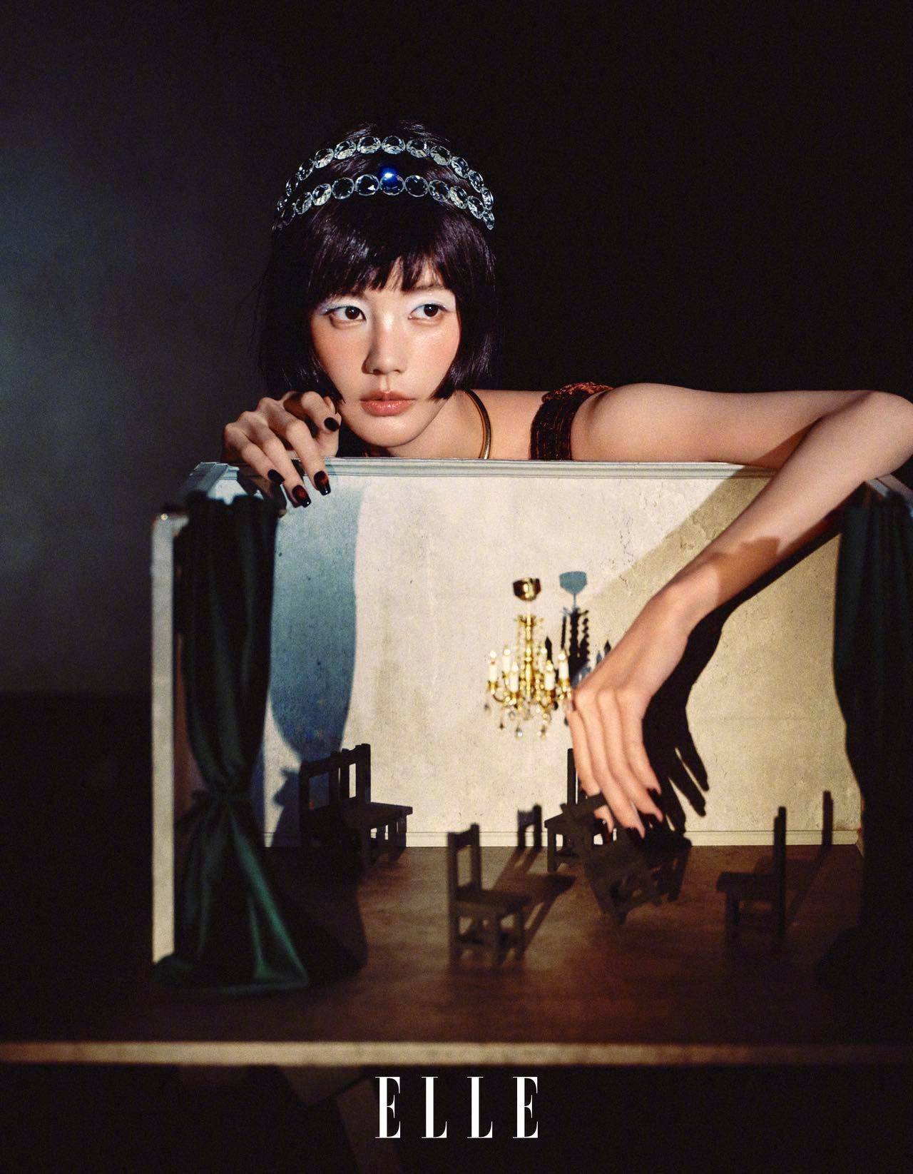 李一桐戴钻石头饰,眼神灵动。
