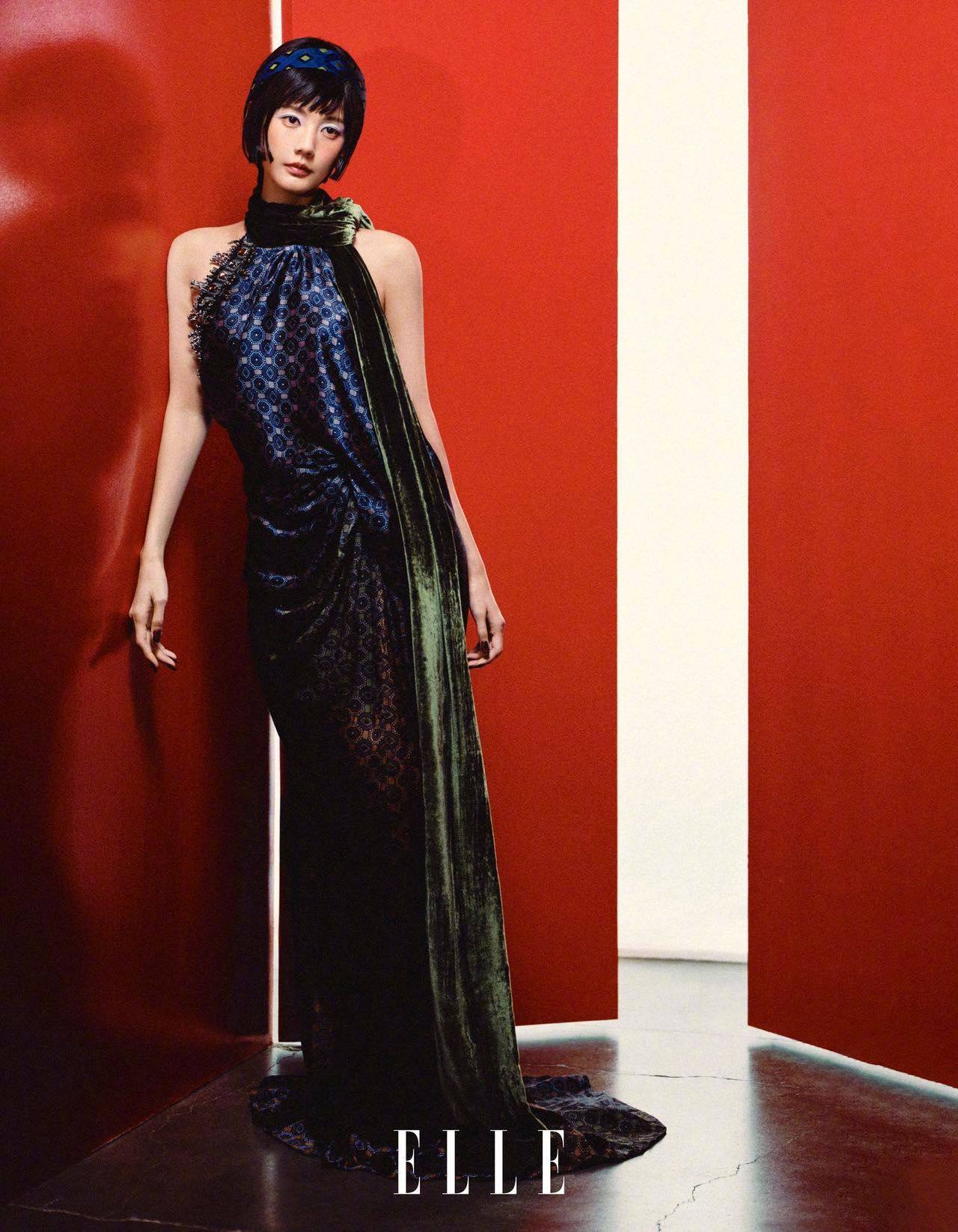 李一桐穿挂脖长裙,复古又优雅。