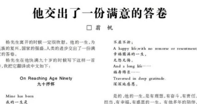 直到19号凌晨,翁帆才通过《光明日报》发了悼文,她写道:"他交出了一份满意的答卷"。