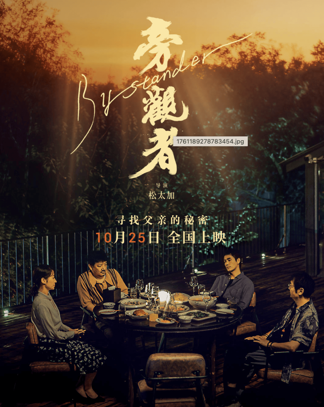 电影《旁观者》由松太加执导、杜庆春监制,陈坤、王砚辉、刘敏涛领衔主演,容中尔甲、安泽豪、陈依莎、单禹豪主演,王劲松特别出演,影片讲述了离家十六年的陈家辉(陈坤 饰)在得知父亲陈为民(王劲松 饰)病危后,重返故乡,葬礼之后,陈家辉与哥哥陈家兴(王砚辉 饰)、姐姐陈家媛(刘敏涛 饰)在整理父亲遗物时,逐渐察觉父亲身上似乎隐藏着许多不为人知的秘密。带着困惑与心结,陈家辉开始探寻父亲生前的生活轨迹,试图拼凑出父亲真实的模样……