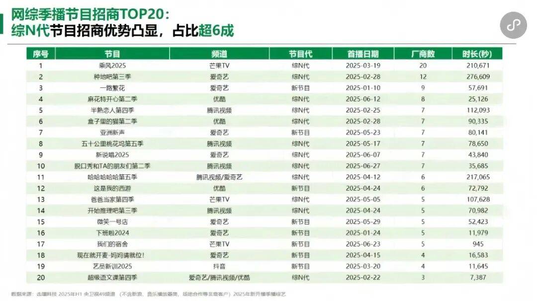 据击壤洞察数据,今年上半年,综N代节目的招商核心竞争力虽还在持续凸显,在网综季播节目招商TOP20榜单中占比超六成,可不同IP的招商表现却呈现出鲜明的两极分化。《乘风2025》的招商品牌数量从上一季的8家大幅增至20家,而《盒子里的猫2》从上一季的12家降至8家,《种地吧3》更从28家断崖下跌至12 家。