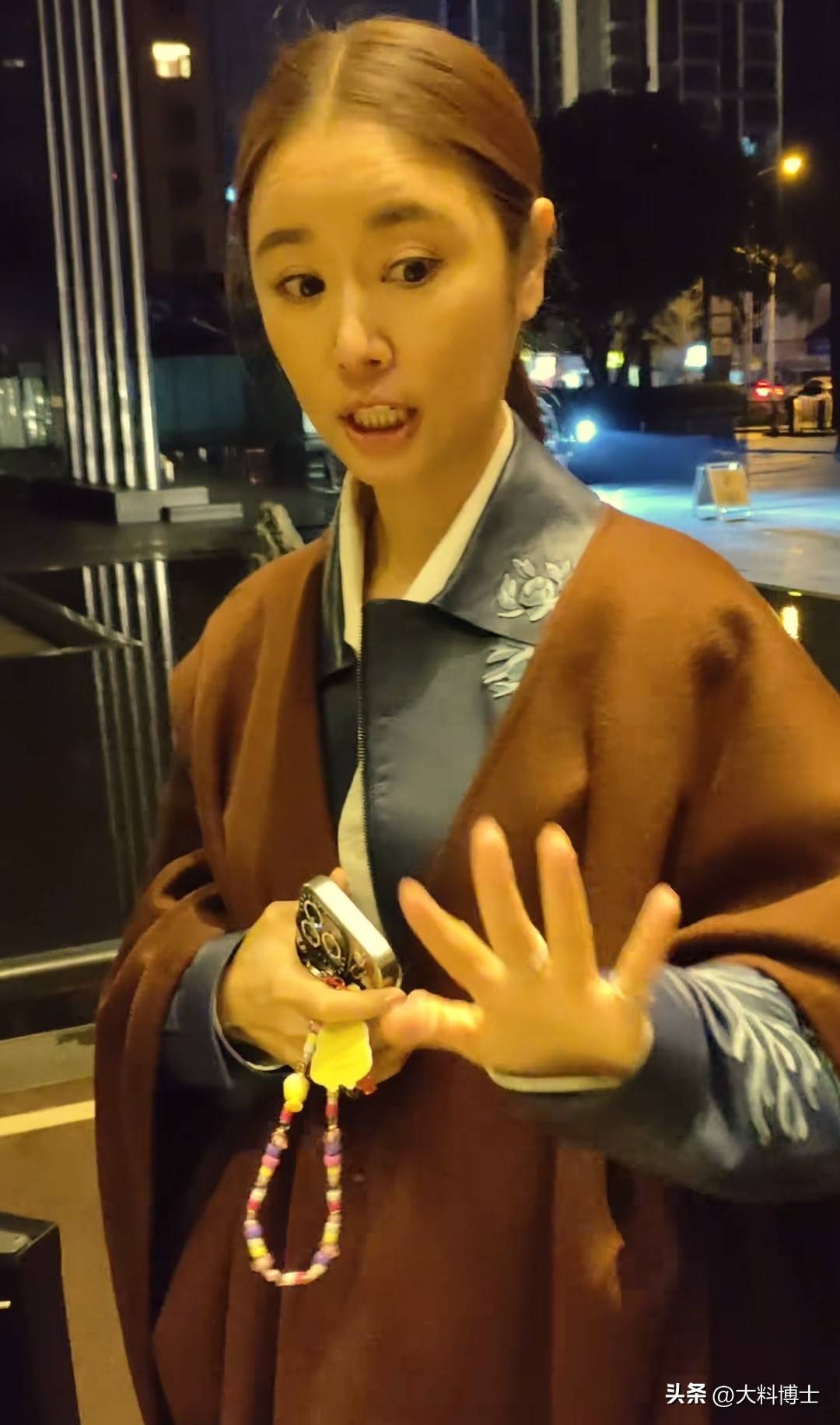 她披着一件披风,手里拿着手机,挥手跟酒店门口等待的粉丝打招呼,还小心提醒他们注意安全,不要拥挤。