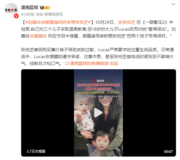 10月24日,张柏芝在《一路繁花2》中坦言,自己对三个儿子采取温柔教育,但18岁的大儿子Lucas反而对她“管得很凶”。刘嘉玲则在节目中透露,谢霆锋母亲称赞张柏芝“把两个小孩养得很好”。