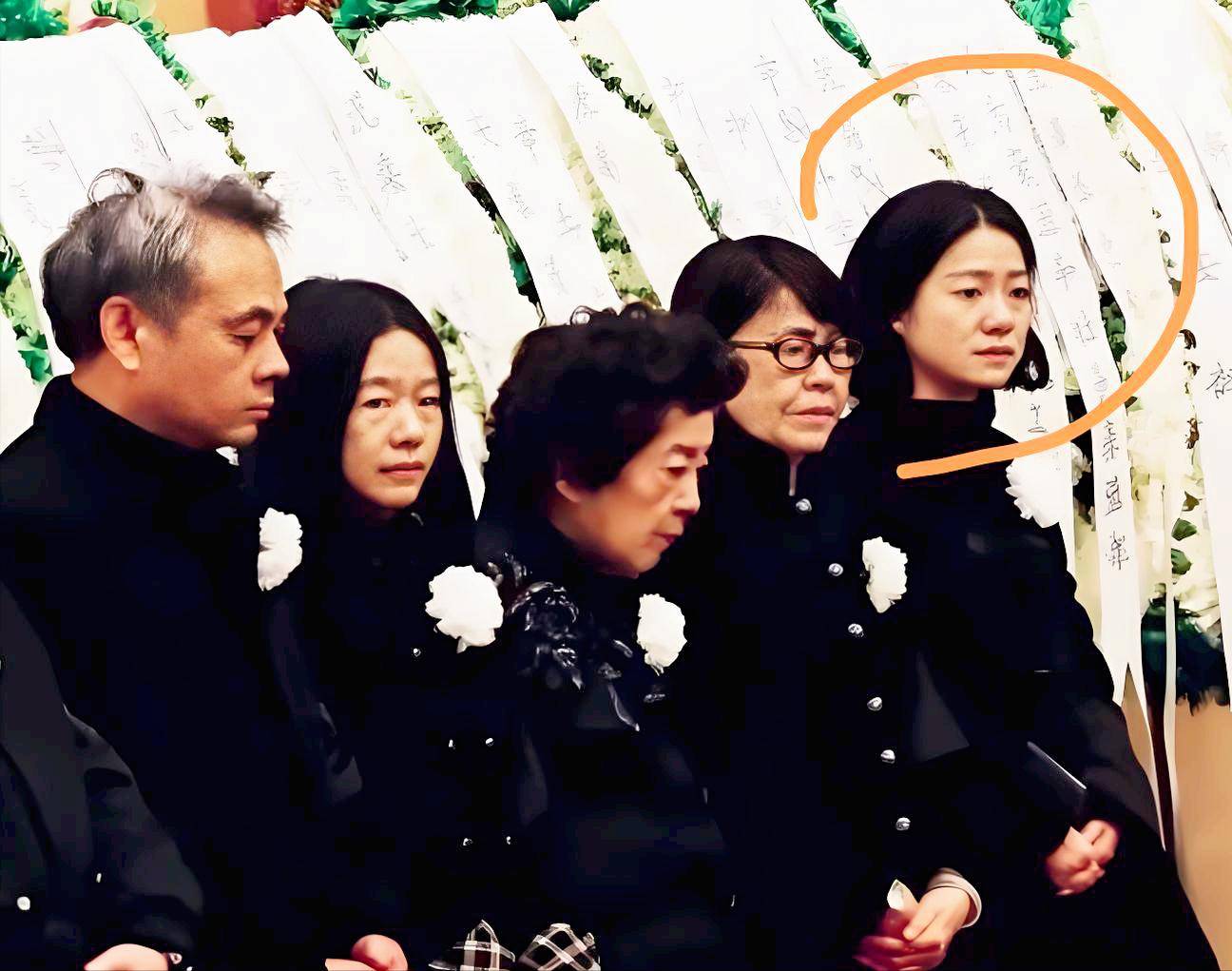 葬礼上的翁帆一身黑衣黑裤,胸前别着一朵白花,满脸憔悴、悲戚。