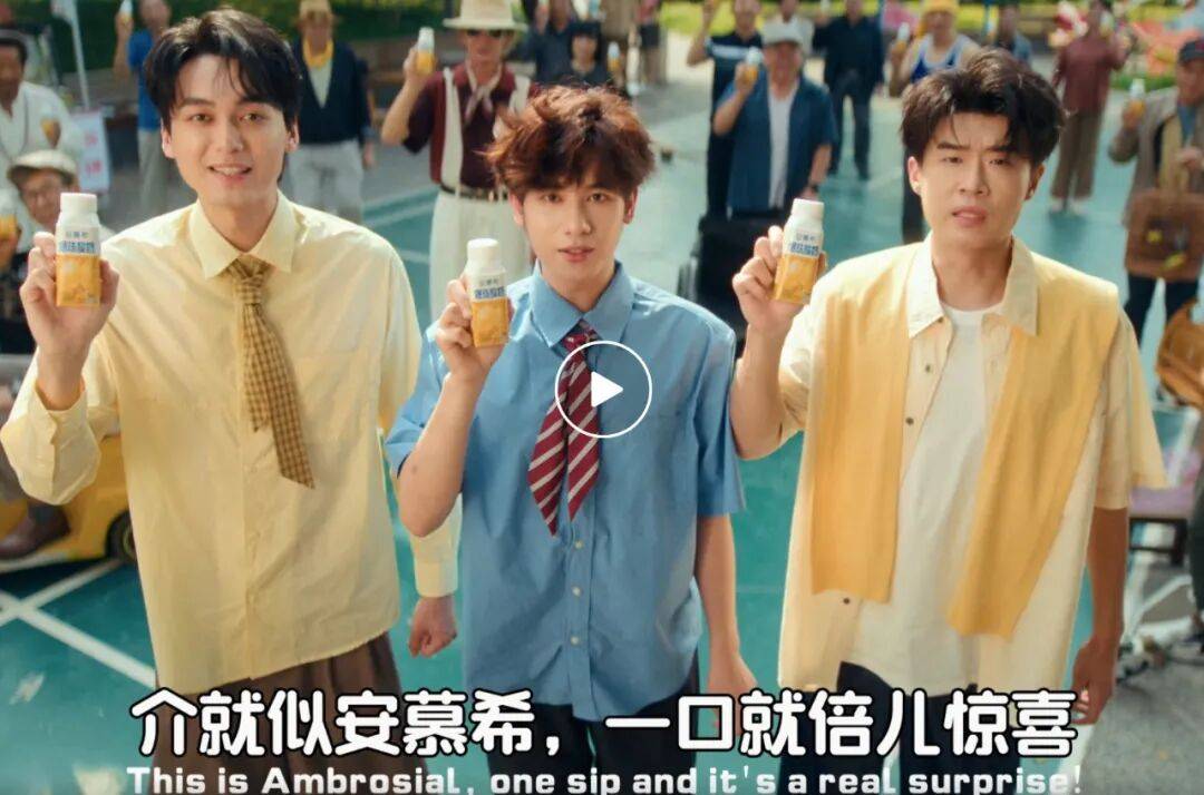 “介就似安慕希,一口就倍惊喜……”,这组被称为“帅哥喜剧”的破圈TVC在社媒平台讨论度极高,究其原因,无论是天津话接地气风味的广告贯口、还是cue到路边跳水天津伯伯的社会热点抽象梗、还是小胡一边穿大褂玩快板一边安利安慕希,这种“整个片子都在使力整活儿”的新式幽默正好契合了当下年轻人超前的精神状态,让人笑着笑着就不自觉想跟着哼起这些“天津说唱”。