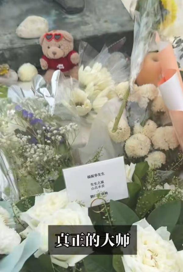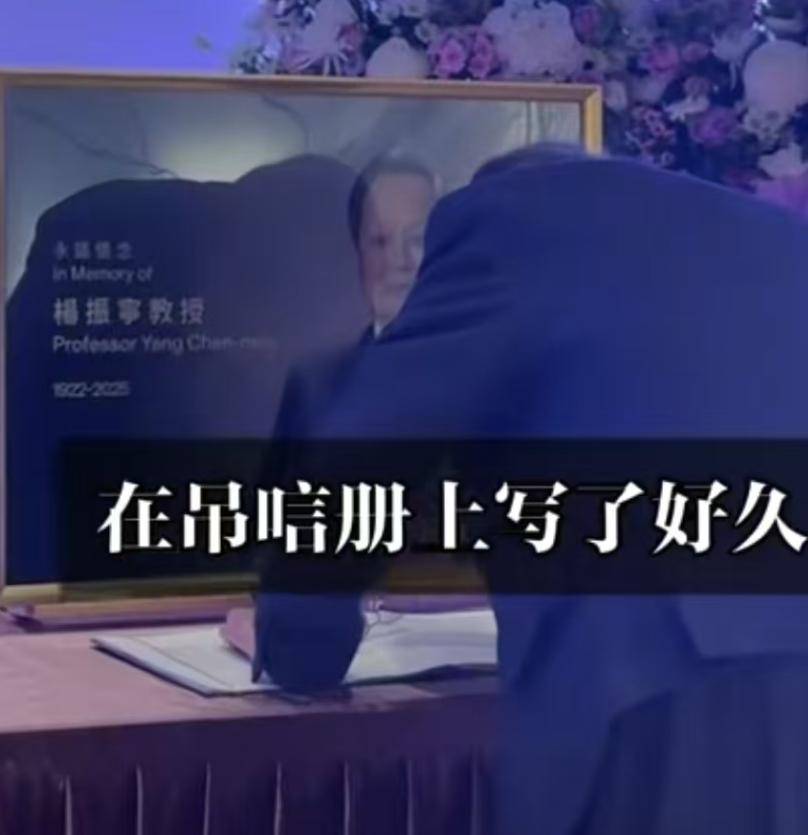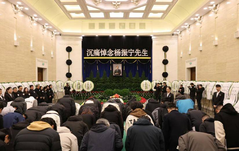 杨振宁的追悼会如期举行,追悼会内场放满各界人士送的挽联,来宾们都穿上黑白灰色服装,面色沉重,深深的弓下腰,为杨振宁送行。
