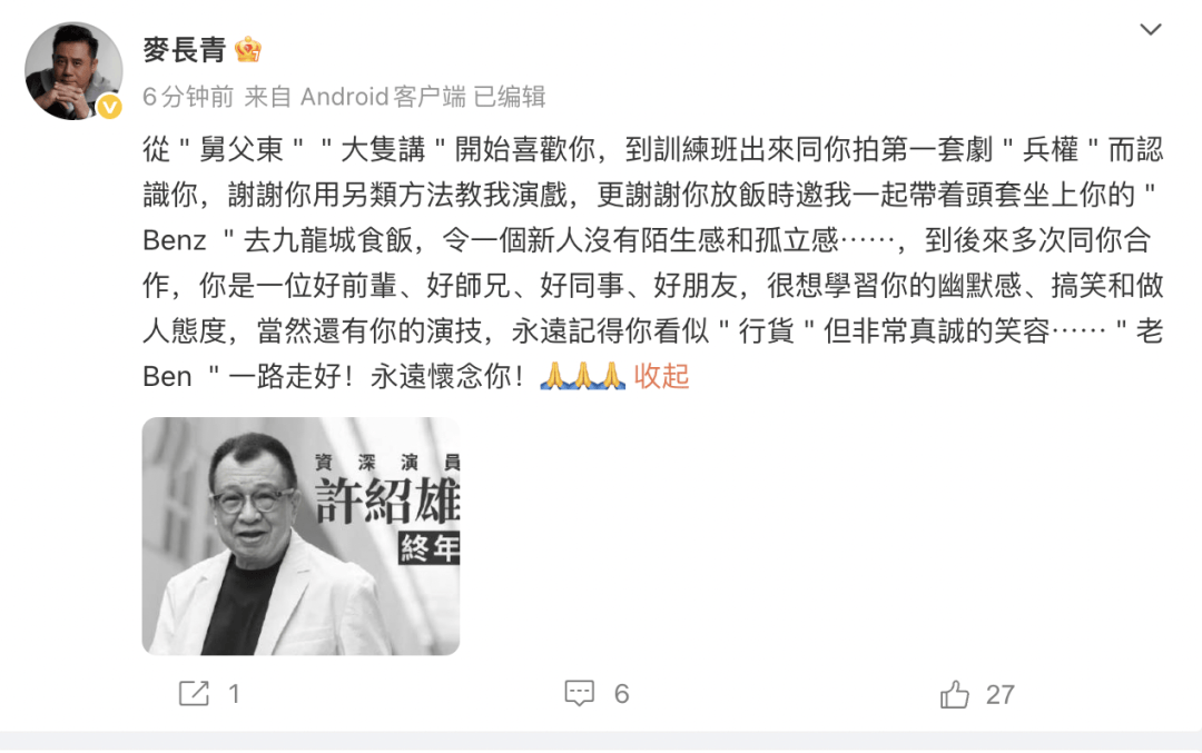 还有很多明星都发文悼念了,可见许绍雄人缘有多好。