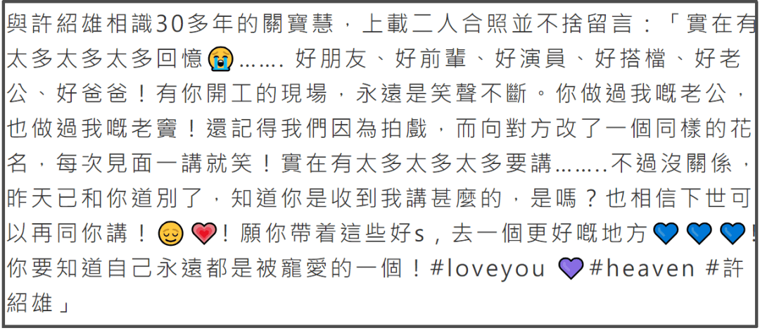 惠英红发博悼念许绍雄:“愿天堂沒有病痛,安息 ” ,两人认识多年,近年在《无限超越班》中还 合体录制。