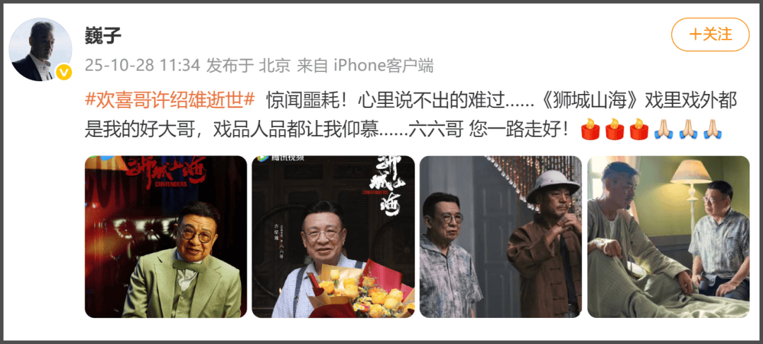 巍子晒出多张许绍雄工作照悼念,表示听闻噩耗很难过,许绍雄不论戏里戏外都是好大哥,仰慕他的戏品和人品。