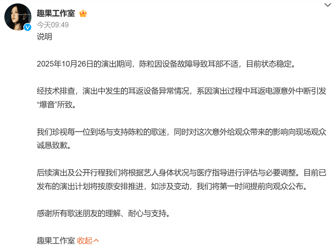 10月27日,陈粒工作室@趣果工作室 发布情况说明:经技术排查,演出中发生的耳返设备异常情况,系因演出过程中耳返电源意外中断引发“爆音”所致。同时,工作室对这次意外给观众带来的影响向现场观众诚恳致歉。