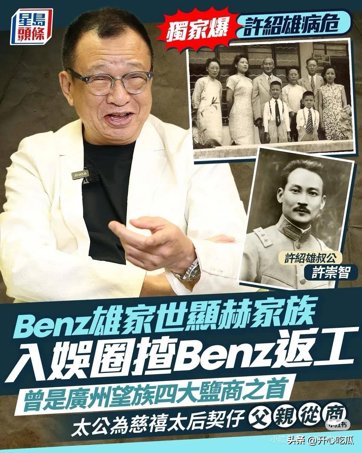 76岁的许绍雄和鲁迅妻子许广平是亲戚,称呼鲁迅为“姑爷爷”,他家境优渥,祖上是广州越秀区的徐氏家族,在清朝为四大盐商,一度有“广州近代第一家族”的称号,许绍雄七十年代进入TVB就因为开奔驰上班,而被冠以“Benz雄”的称号。