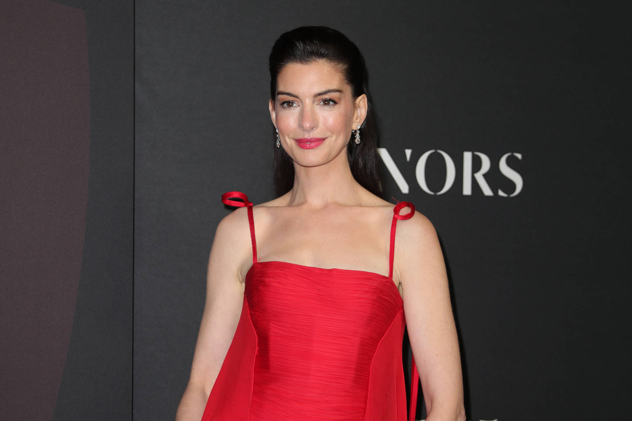 安妮·海瑟薇穿红色吊带裙明艳动人。
