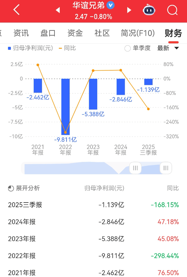 搜狐娱乐讯 (哈麦/文)10月29日晚,上市公司华谊兄弟公布三季报,前三季度营收2.155亿元,同比下降46%。净利润亏损1.139亿元,同比下降168%。
