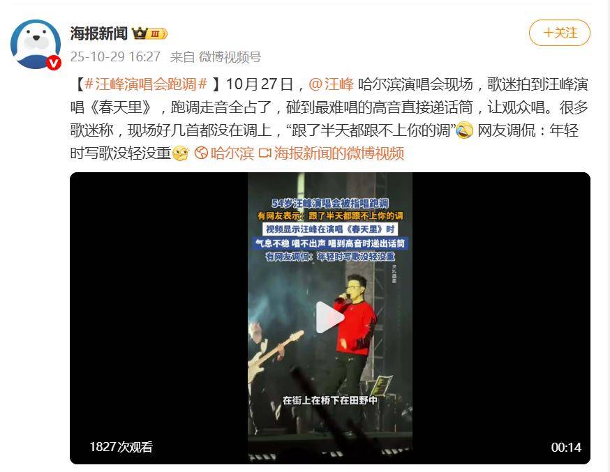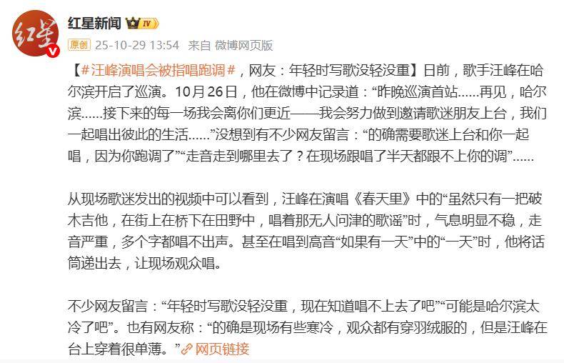 值得一提的是,汪峰在演出前还发微博承诺“邀请歌迷朋友上台,我们一起唱出彼此的生活”,没想到网友直接回怼:“的确需要歌迷上台和你一起唱,因为你跑调了!”尽管有人为天气因素辩解——“哈尔滨太冷,汪峰穿得单薄”,但更多声音质疑:作为专业歌手,为何不提前降调或优化选曲?观众为怀念青春付费,但不代表愿意为“走音现场”买单。