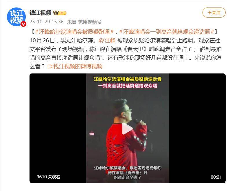 汪峰在哈尔滨的巡演现场,竟因“唱不上去”被送上了热搜。据10月29日报道,歌迷拍下的现场视频里,汪峰不仅频频跑调,唱到《春天里》最高潮处更是直接“甩锅”,把话筒塞给观众接唱,引发网友集体吐槽:“这波操作,是情怀互动还是实力掉线?”