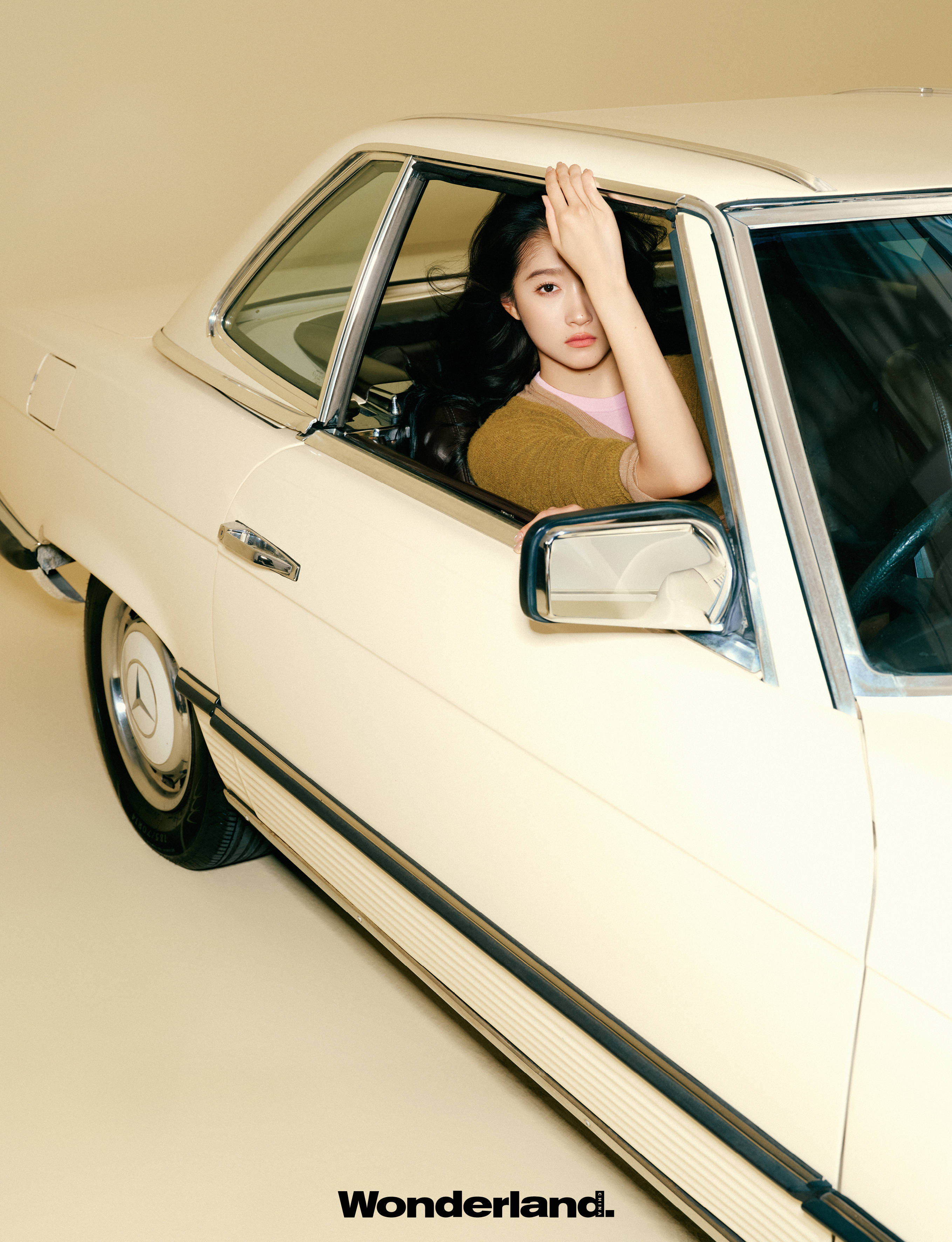 关晓彤坐在车内,姿态随性。