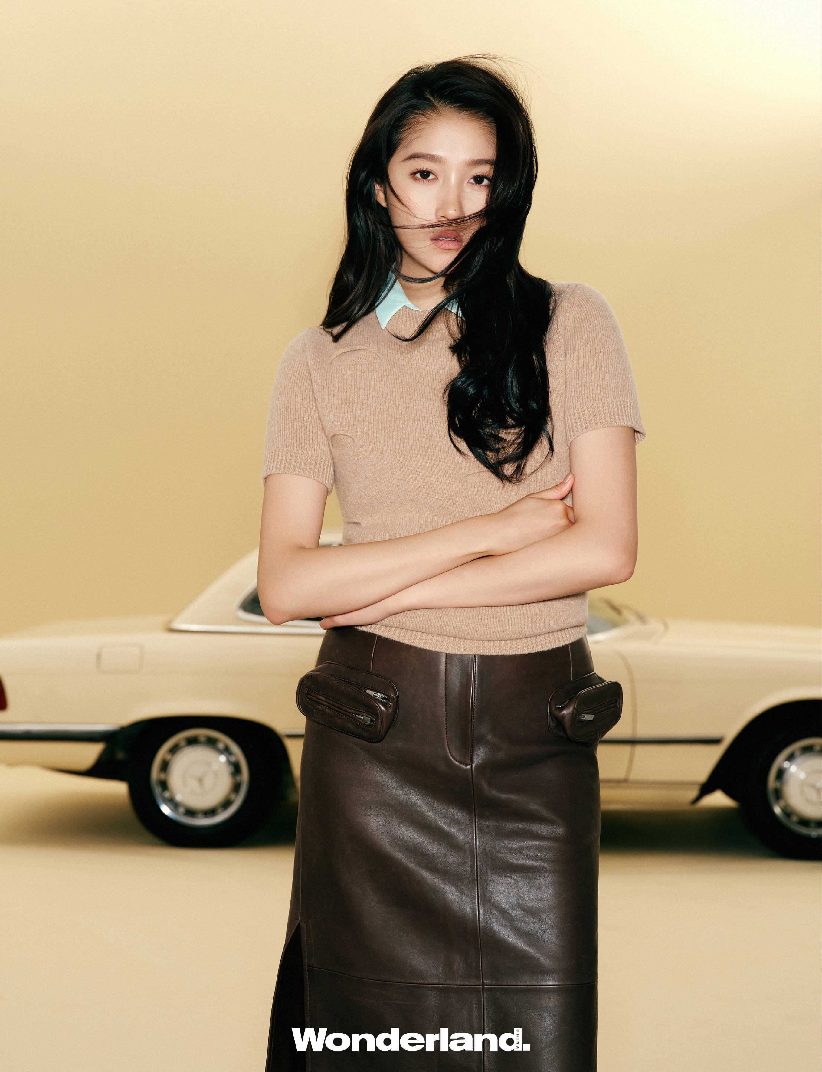 搜狐娱乐讯 10月30日,关晓彤的一组时尚大片曝出。图中,她穿着米色针织衫配棕色皮裙,发丝飞扬,妆容清淡。