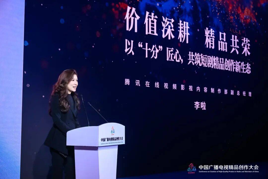 腾讯在线视频影视内容制作部副总经理李啦带来的分享主题为《价值深耕-精品共荣以“十分”匠心,共筑短剧精品创作新生态》,她表示短剧行业现在已经迎来了“提质减量、价值升维”的高质量发展新阶段,并坚信“长期主义”是通往未来的唯一路径。