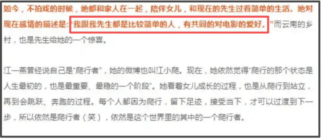 但是直到2022年,江一燕接受媒体采访的时候,才吐露自己已经结婚,还表示和赵汉唐都是比较简单的人,有共同对电影的爱好,定居在云南的某个乡村里,生活很惬意。