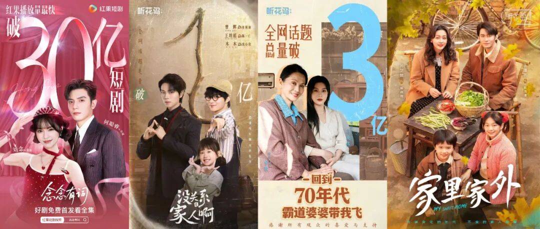2025年听花岛的多部短剧在播放和口碑上取得了不俗的表现,并在视听语言、情感表达和叙事风格上,持续受到观众的认可。除了《十八岁太奶奶》系列,《念念有词》构建了一对话痨小太阳和哑巴高冷总裁的组合,全程小甜剧的基础上,以明亮、可爱的色调、女主的妆造、配合台词场景的背景音等等增强了这种甜蜜感,浪漫中又不失治愈的幸福感,细腻而恰当;《没关系是家人啊》采用单元剧形式,走起了奇幻风,通过主角三人侦破案件,从敌对到挚友,将案件的奇诡与家庭的温情融合在一起,而每个单元故事在反转间又分别有关于爱情、友情、亲情等的呈现和讨论;《回到70年代霸道婆婆带我飞》则将故事放在了贫穷年代文中,讲述了一个以真心换真心的“乡村治愈爱情故事”,泛黄的色调、符合年代和身份的服化道保证了年代剧的质感,其中的群像也受到不少观众的好评,女主与婆婆的错位亲情也与不少观众达成了情感共振;在观众感受过第一部一家人共同抵御风雨的信任与扶持故事和情感内核后,即将上线的《家里家外2》也承载着期待,将成为推动短剧年代剧的精品系列化的又一步。