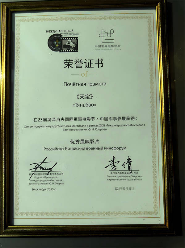 10月26日,第23届俄罗斯奥泽罗夫国际军事电影节在“英雄之城”图拉市举行隆重的颁奖典礼。由中共阿坝州委、阿坝州人民政府共同摄制的重大革命历史题材影片《天宝》,一举斩获“最佳国际外语片奖”与“最佳摄影奖”两项大奖。
