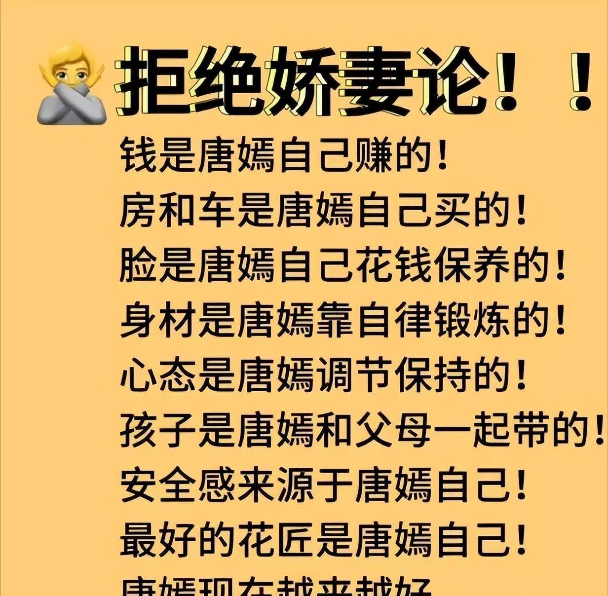 事情的起因是一张“拒绝娇妻论”的照片在网络上流传,照片中详细列举了唐嫣如今所取得的成就,并强调这些都是她自己努力的结果,而非依靠丈夫,这一观点引发了网友们的热烈讨论。