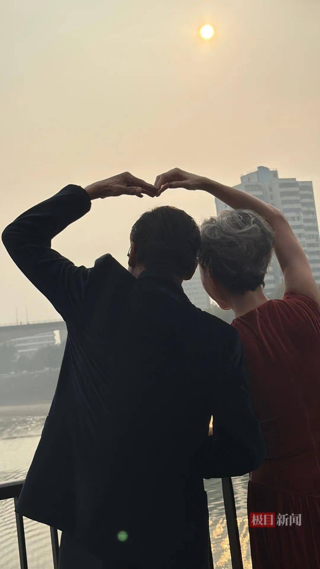 在合影环节,梁家辉与叶童在行进的游船上一起“比心”,二人的背影在远处夕阳余晖的映衬下,宛如从电影里走出来的一幅画。
