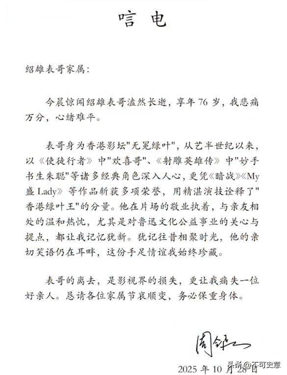 许绍雄走了以后,鲁迅的长孙周令飞发了唁电,说 “表哥突然走了,心里又痛又可惜”,还说 “他做人做事都是榜样,亲戚朋友都尊敬他”。