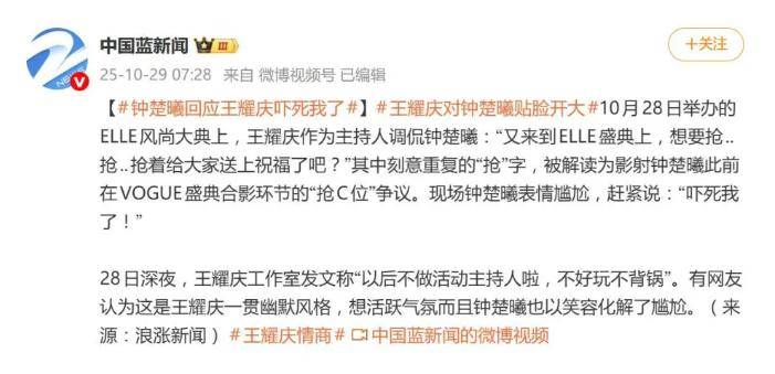 在主持过程中,王耀庆与明星钟楚曦展开了对话。令人惊讶的是,钟楚曦近期因在Vogue盛典上抢C位的事情引起了广泛关注,成为舆论的焦点。在这种敏感时刻,大家都知道不该轻易提及此事,然而王耀庆却不顾场面,言辞不慎,竟多次调侃钟楚曦“抢”了C位。钟楚曦听到这些话后,明显感到不适,她面露尴尬,只能说了一句“吓死我了”,试图用这句话化解尴尬。