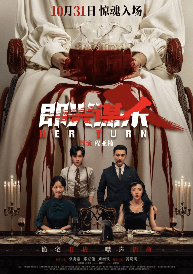 打头阵的是 10月31日上映的悬疑片 《即兴谋杀》。影片围绕豪门少女继承家产的核心事件,在古堡密闭空间中展开一场充满谎言与陷阱的心理博弈。李庚希、邓家佳、黄晓明等演员演绎各怀秘密的角色,共同营造久违的惊悚氛围。