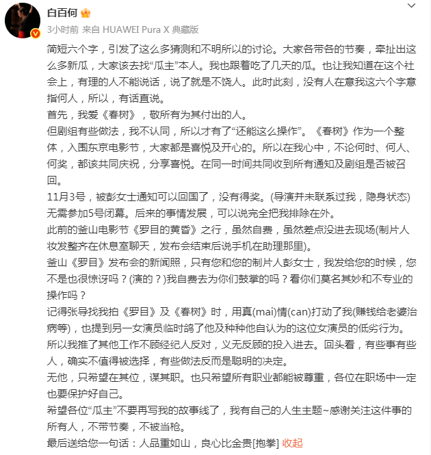白百何虽然受了委屈,但她已经把气撒出来了,虽然没拿奖,但连续爆了好几天的热搜,也算重新回归大众视野。从这个角度看,《春树》的电影节纷争,到头来又未尝不是一种双赢…甚至多赢的局面呢?